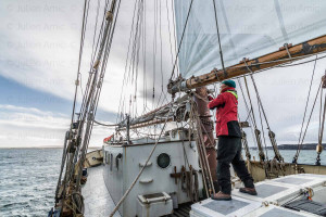 Sur la goélette De Gallant en Atlantique. La Blue Schooner Company affrète depuis novembre 2017 la goélette Gallant, construite à Vlaardingen au Pyas-Bas et lancée en 1916. Ce bateau, à l’origine voilier de pêche au hareng, puis caboteur et école de voile et désormais reconverti en cargo « à la voile » est basé à Douarnenez en Bretagne. Cette navigation qui a eu lieu au printemps 2018 est l’occasion de prendre en mains ce bateau en rejoignant Madère, les îles canaries, les îles Desertas et les açores avec un équipage bénévole, parfois novice. L’occasion de manœuvrer les 415m2 de gréement à la force des bras et de croiser baleines et dauphins au milieu de l’atlantique.